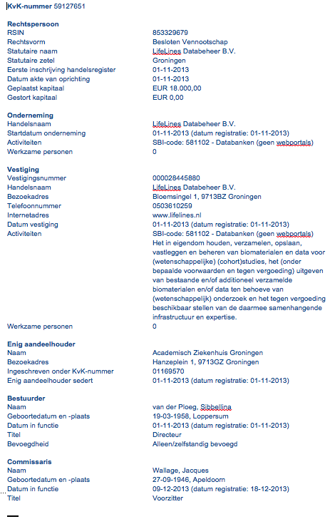 Toen stuitten de hulp-koeien op een vacature. Van mevrouw S vd P. Op naam van Medische BioBank Noord-Nederland bv. Aha! Medische BioBank Noord-Nederland bv. 100% dochter van LifeLines bv. Dit zegt het Klompen voor Klompen uittreksel: