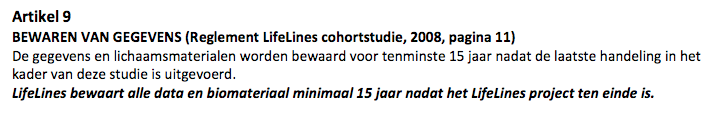 LifeLines duurt 30 jaar. Men behoudt zich het recht voor om de data minimaal 15 jaar na afloop te bewaren. Minimaal = oneindig.