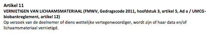 Iedere deelnemer mag verzoeken alle data en lichaamsmaterialen te vernietigen. Maar wat is vernietigen? De meeste databases behouden de informatie maar zetten deze op onbeschikbaar. Maar de data is er nog wel. En wat te denken van backups? Hoe wordt hier op toegezien? Hoe wordt dit gegarandeerd?