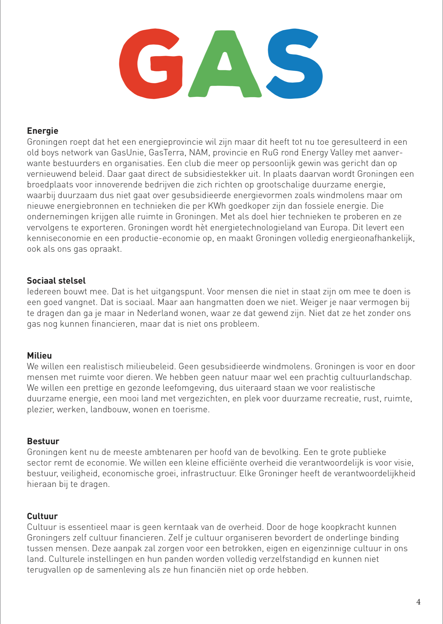 Geen enkele Nederlandse politieke partij – in kabinet of in oppositie – heeft de afgelopen decennia iets gedaan voor de veiligheid en de belangen van Groningen: ondanks sterke aanwijzingen over aardbevingen en onveilige situaties hebben ze winstmaximalisatie van gaswinning doorgedrukt en geaccepteerd en weggekeken.