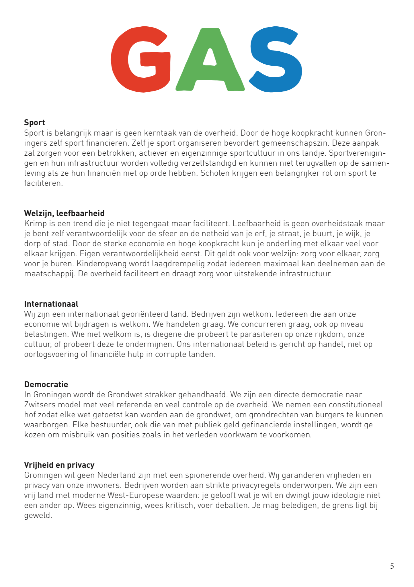 Gasstaat Groningen is één van de rijkste landen ter wereld. We zijn de nummer vier van rijkste regio’s in Europa. We willen een kleine betaalbare overheid die de economie op één zet, die zorgt voor groei, die slim omgaat met energie en export, en die met fondsen werkt. De begroting mag niet negatief zijn, en bestuurders dragen persoonlijke verantwoordelijkheid. Op banken wordt streng toegezien. Financiële woekerproducten zijn verboden. Banken dienen niet alleen spaar-