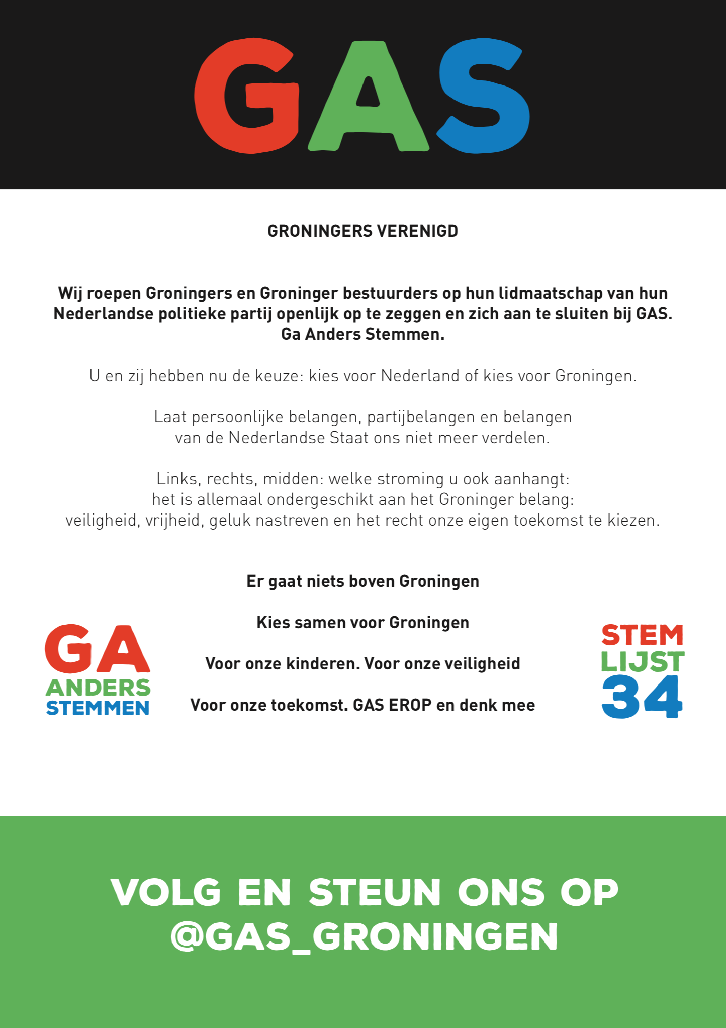 Wij roepen Groningers en Groninger bestuurders op hun lidmaatschap van hun Nederlandse politieke partij openlijk op te zeggen en zich aan te sluiten bij GAS. Ga Anders Stemmen.