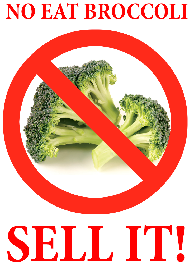 Ik heb echt een pesthekel aan broccoli. Maar! En! Dus! Ik kan het verkopen als de beste. Ik overtuig de grootste broccolihater van de hele wereld en van Venus en van Mars dat ze broccoli willen kopen. Van ons. Veel broccoli. Van niemand anders.