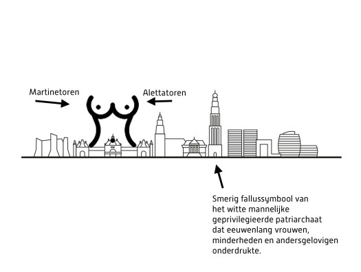 Groningen, 8 juni 2020 – “De Martinitoren is een fallussymbool van eeuwenlange overheersing van vrouwen, minderheden en andersgelovigen door het witte mannelijke geprivilegieerde patriarchaat.”
