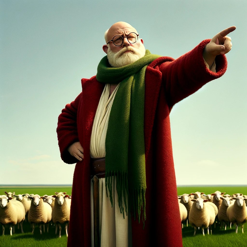 “Dag lieve knuffelschaapjes, kom maar bij mij, jullie herder. Ik beloof jullie de groenste weilanden, en ik bescherm jullie tegen de grote boze enge wolf.”