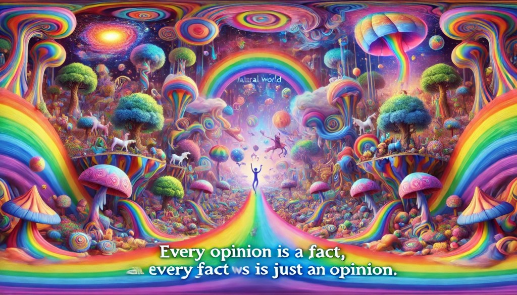 In deze psychedelische wereld vol prachtige regenbogen en dansende eenhoorns is elke mening een feit, en is elk feit maar een mening. Natuurwetten staan op hun kop. Alles is zweverig, want wist je wel dat zwaartekracht is uitgevonden door Newton, een witte chauvinistische man uit koloniale patriarchale overheersende structuren? Zwaartekracht is derhalve racisme. Wokeland is divers, inclusief, intersectioneel feministisch en gelijkwaardig. Niet toegankelijk voor witte mannen.