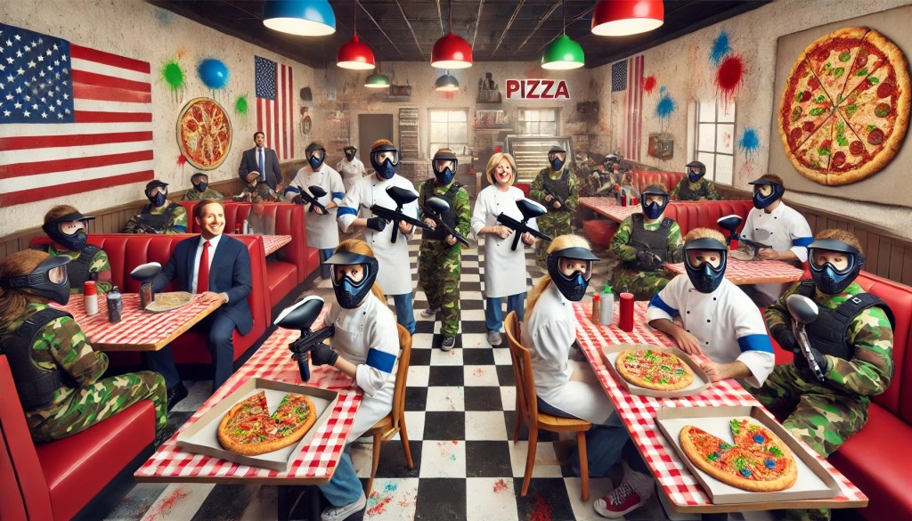 In deze spectaculaire indoor paintball game is het jouw taak om door het WEF ontvoerde kinderen die worden misbruikt te bevrijden. Je eigen kinderen mogen meedoen! Zorg dat je alle politici uitschakelt, maar niet de restaurantmedewerkers of de kinderen. Pizza-lunch is inbegrepen.