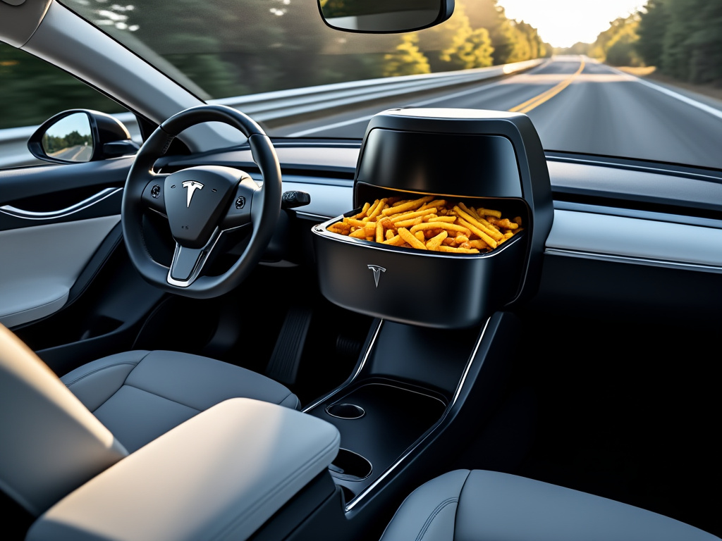 Een airfryer in je auto. Briljant. Nu we er zo bij stilstaan. Waarom niet ook een mammatron? En een koffieautomaat? Een grotere koelkast voor de halve liter blikken Schultenbrau? Die auto rijdt toch zelf! En waarom geen ingebouwd automatisch toilet in de stoelen? Potdomme mienjongens. Wat is de toekomst toch mooi.