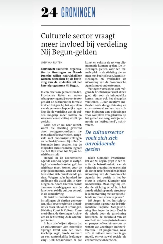 Vertegenwoordiging zou volgens de briefschrijvers niet alleen goed zijn voor de inhoudelijke kennis, maar ook het draagvlak versterken. “Door ondernemende methoden zoals design thinking, marktanalyse, marktvalidatie en cross-sectoraal innoveren kan ondernemerschap bijdragen aan oplossingen voor complexe vraagstukken zoals het rendement van kunst en cultuur uit publieke en private bijdragen, en de cultuur, brede welvaart en leefbaarheid in de regio.”